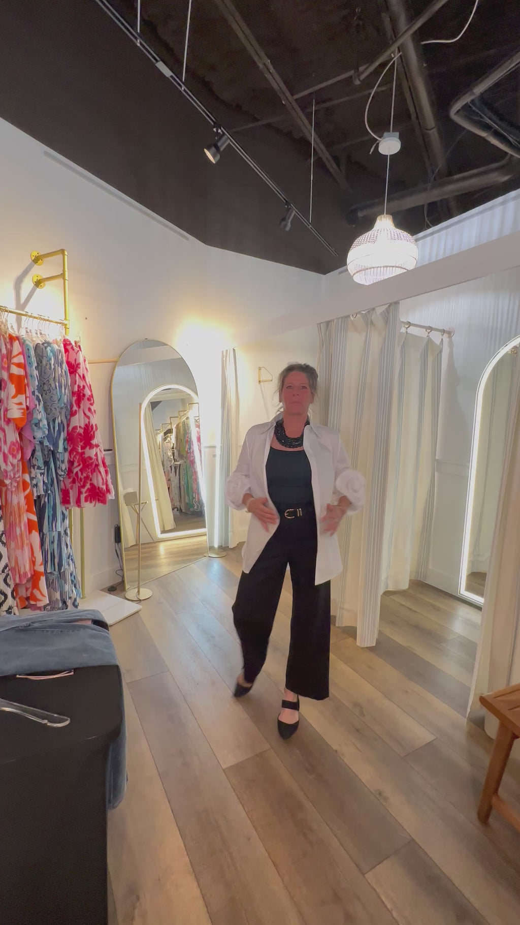 White button-front blouse with dramatic rosette cuffs. Clean lines, structured collar, and a refined fit. Perfect for dressing up denim or pairing with tailored pieces.